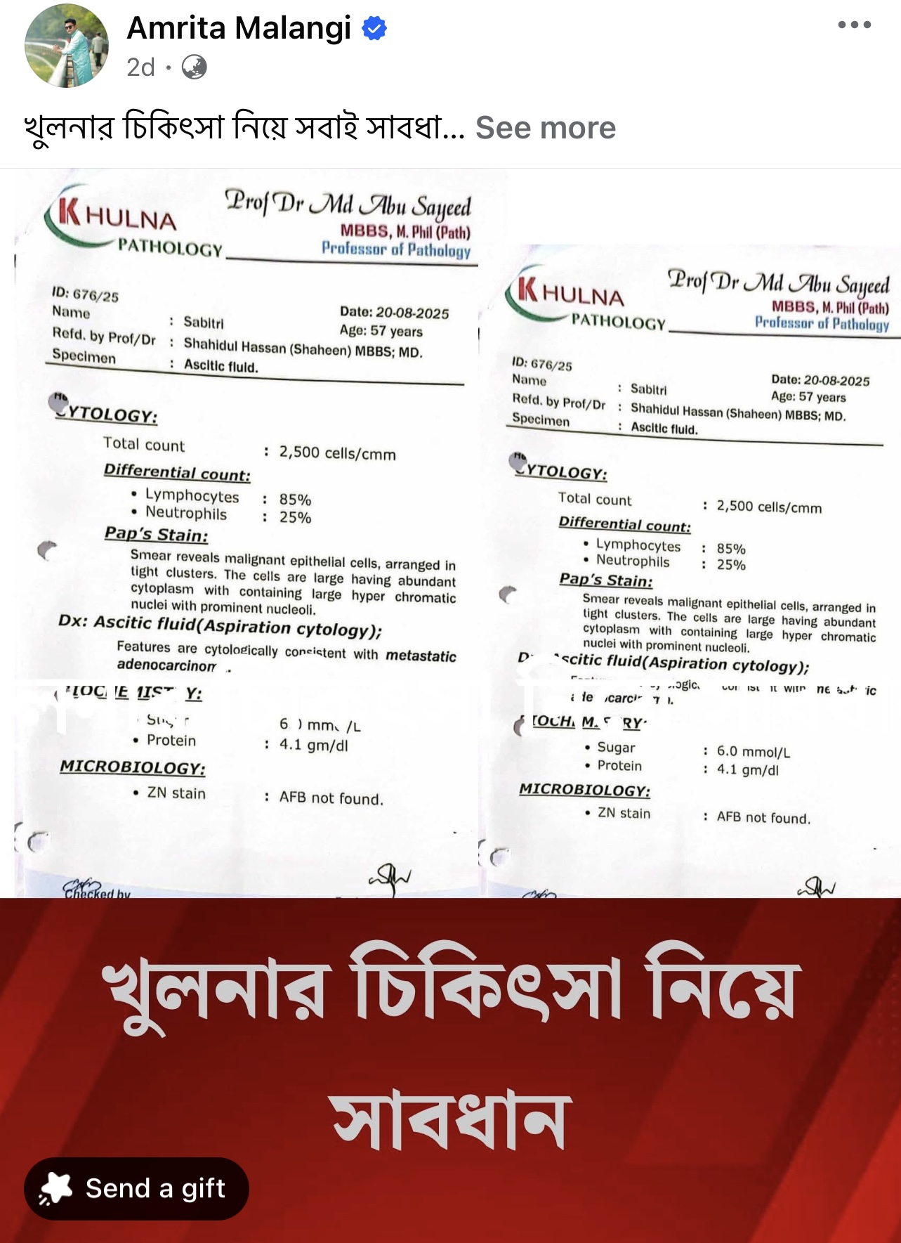তিনি খুলনাবাসীকে সচেতন হওয়ার আহ্বান জানিয়ে লিখেছেন, “চিকিৎসা নিয়ে সবাই সাবধান হোন। প্রয়োজনে দ্বিতীয় মতামত নিন। জীবন নিয়ে কোনো ঝুঁকি নয়।”