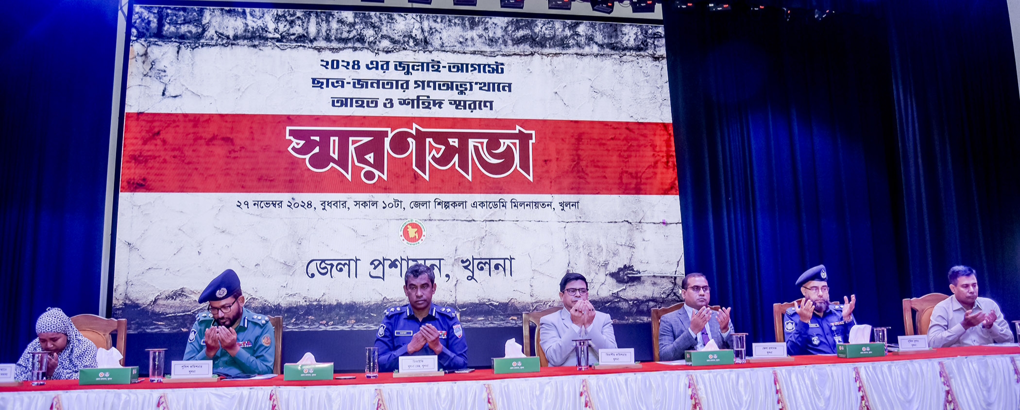 স্টাফ রিপোর্টারঃ ২০২৪ এর জুলাই-আগস্টে ছাত্র-জনতার গণঅভ্যুত্থানে আহত ও শহিদদের স্মরণে সভা বুধবার সকালে খুলনা জেলা শিল্পকলা একাডেমি অডিটোরিয়ামে অনুষ্ঠিত হয়। খুলনা জেলা প্রশাসন আয়োজিত স্মরণসভায় প্রধান অতিথি ছিলেন বিভাগীয় কমিশনার মোঃ হেলাল মাহমুদ শরীফ।